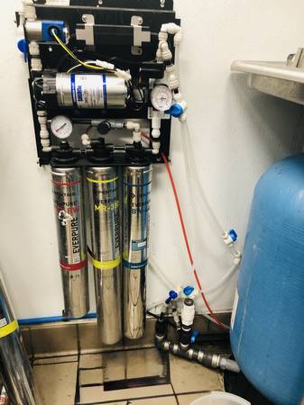 The custom bronze facing GB5 La Marzocco espresso machine was handmade and shipped from Florence, Italy. Purchased in 2019 for $25,000. The sale also includes the EVERPURE reverse osmosis water filtration system with an osmosis water tank. Purchased separately for $3,500.00.