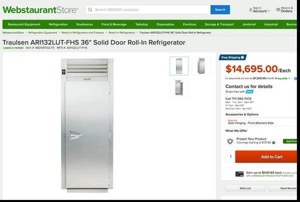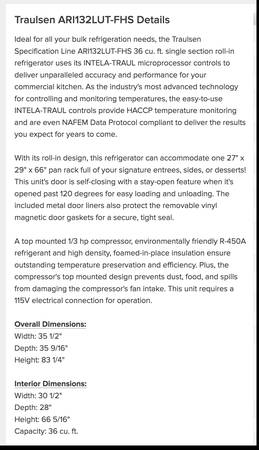 Traulsen ARI132LUT-FHS 35 1/2" One Section Roll In Refrigerator, (1) Right Hinge Solid Door, 115v - Comes with a 30 day guarantee. Selling for $2290.