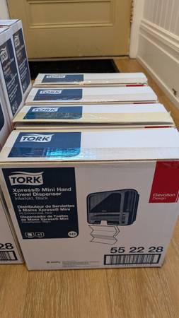 7 unopened paper towel dispensers, still in their boxes. Wall-mounted. For commercial bathrooms and kitchens. $10 apiece. Model: Tork Xpress Hand Towel Dispensers Black H2 I'm selling two different...