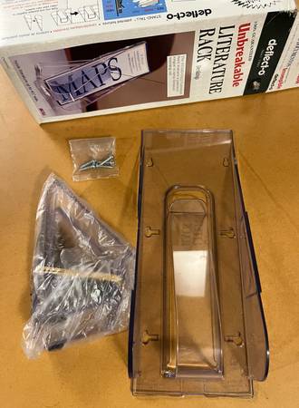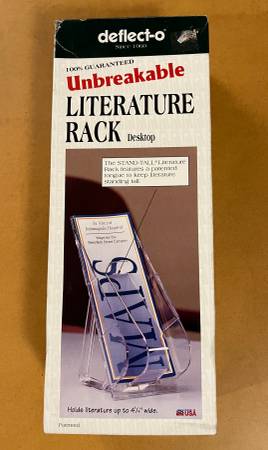 This is a new old stock (NOS) clear polycarbonate marketing literature rack holder. It's leaflet sized (holds up to 4 1/4" wide leaflets). It can be mounted to the wall or stands on desktop. Includes all hardware for both options. The "stand-tall" name is because it has a plastic support to keep the brochures standing upright. The capacity is 2 5/8". The packaging claims it is unbreakable -- polycarbonate is stronger than acrylic.