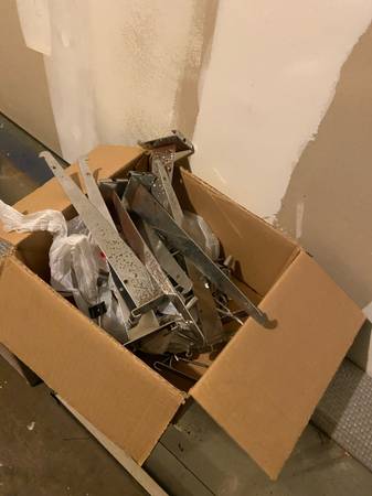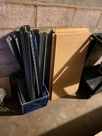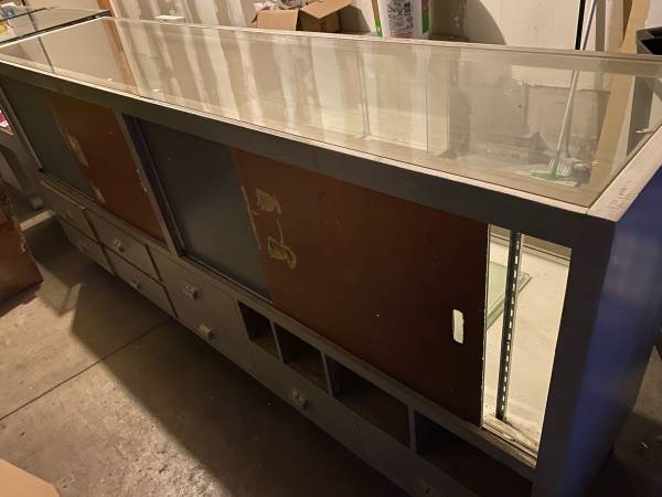 9’ Solid wood showcase with lights storage cubbies and drawers - $250 Grid walls silver and black and hooks - $100 Shelving system -$50 You pick up
