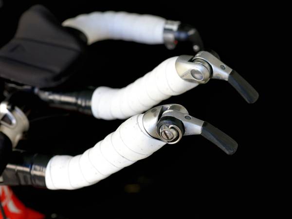It’s built with a 2x10 speed Shimano drivetrain: compact FSA 50/34t crank, 11–28t cassette, Shimano 105 front and rear derailleurs, bar-end 10sp shifters. Stopping power comes from 105 caliper brakes paired with 3T aero levers.