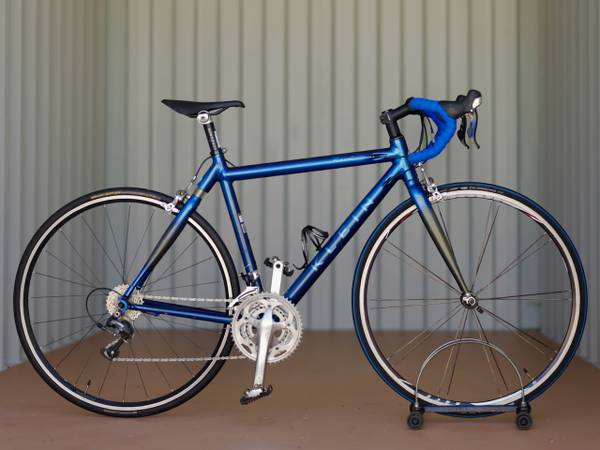 Beautiful indigo blue Klein color. Aluminum frame with a carbon fiber fork and rear stays with very cool rear suspension design. The suspension elastomer has just been replaced. Bike is built up with a 3x10 speed mixed Shimano Ultegra/105 drivetrain. Everything works as it should. Bontrager wheels are true and spin smooth.