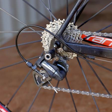 Wheelset is the lightweight and fast Fulcrum Racing One clincher ($1200), spinning smooth and true, with Hutchinson Sector 28mm tires that still have tons of life left. Braking surface on the rim shows minimal wear.