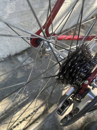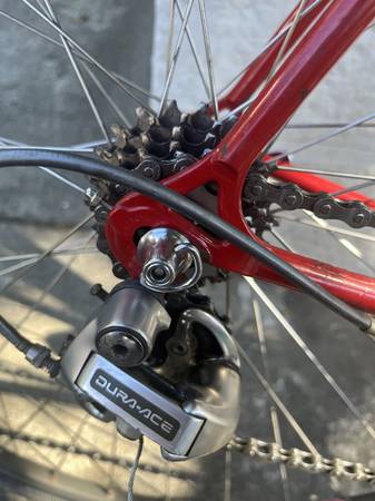 1984 Davidson Challenge model road bike in great original condition. Handmade bicycle with beautiful finish. Original Shimano Dura-Ace 7400 group set (except for the seat post, pedals, quill, brake levers, and chain). Original red paint with only light honest wear. Columbus tubing, No dents. Campagnolo rear dropouts. Chrome Tange infinity forks. Matrix Titan rims. Gatorskins. Original 6-speed index shifting (Dura-Ace 7400 offered the first index shifting system on the market). Light and lively steel. Rides smooth and quick.