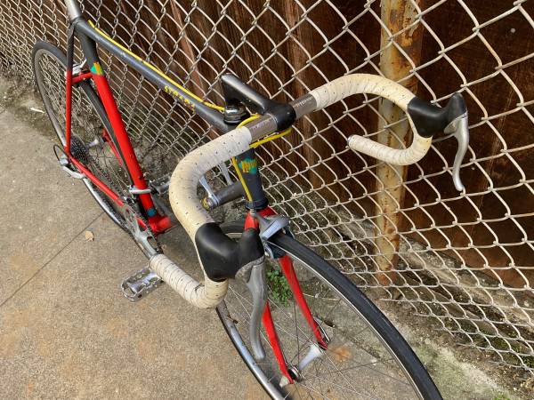 It’s a large frame with drop style bars and currently road/ city-style tires for cruising around parks or the city.
