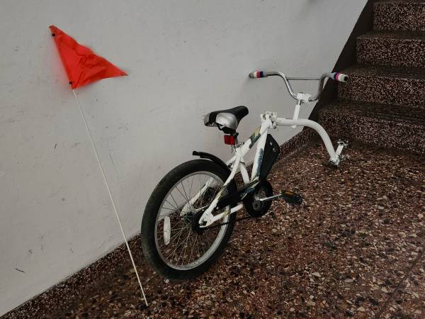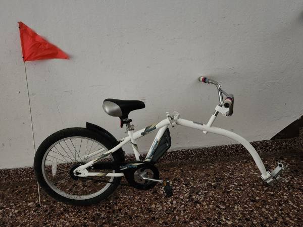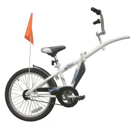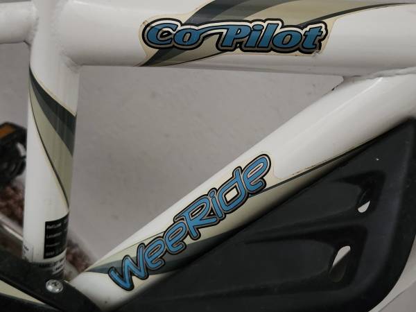 This WeeRide Co Pilot Tagalong Trailer Child Bike Seat is Like New. Safety Flag included. 20" wheel size, Heavy-duty steel frame. Recommended for ages 4 – 9. Great bicycle for your little boy or girl to learn to pedal on and join the fun bike rides with mom or dad. Great for bike trips. Easy to attach to your bike.