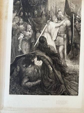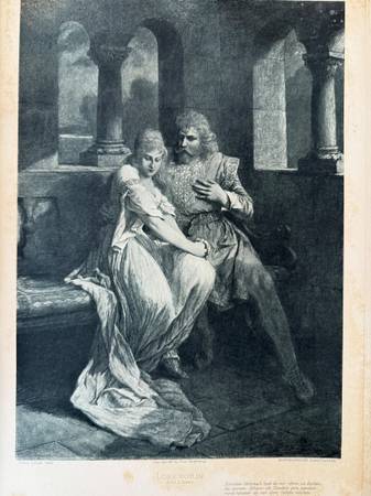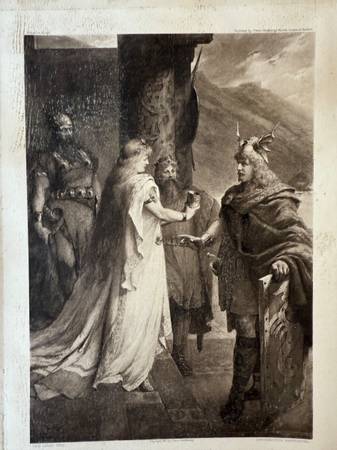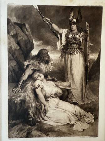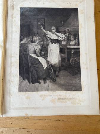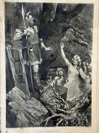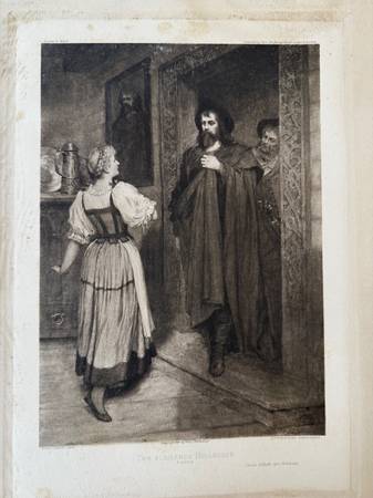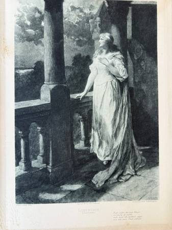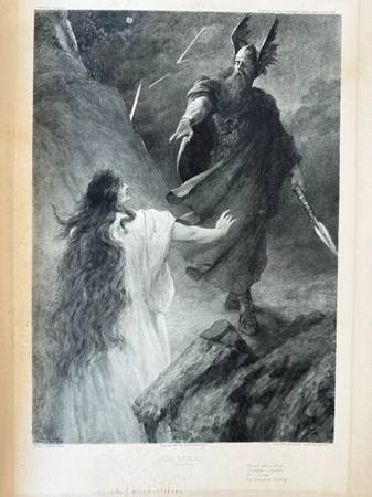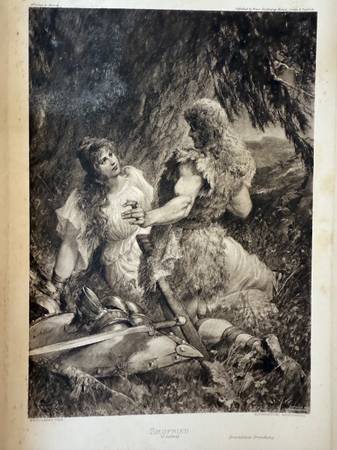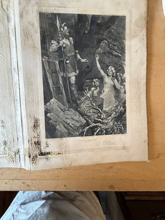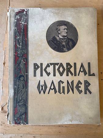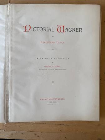 Pictorial Wagner contains 15 copperplate etchings by Herr Ferdinand Leeke depicting scenes from Wagner's operas. The very last page, a scene from Gotterdammerung has some kind of black mold or something on it and I have included a photo of that page. The other 14 pages are relatively clean. Each page says it was copyright 1894. The individual etchings are approximately 7"x10".