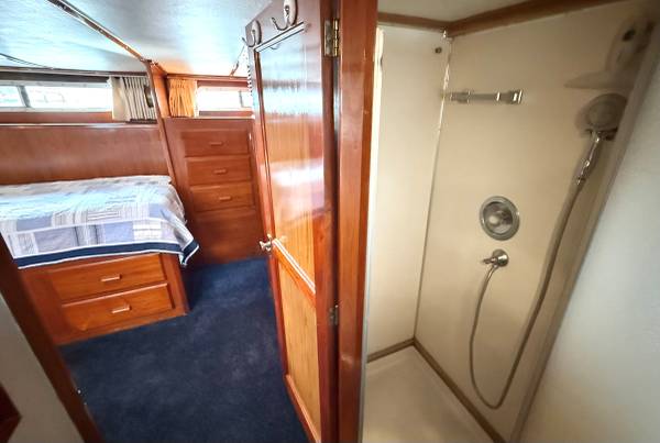 She is equipped with two reversed heat Air Conditioners, both work well. Hot - cold water, two full marine heads with shower stalls and VacuFlush toilets.