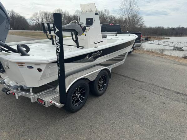 2024 Avid 21 FST is set up with solid electrical gear, including a breaker system, a dedicated electronics circuit with 10-gauge wiring, stainless toggle switches, a battery shutoff, and Deutsch connectors. It has an 800 GPH auto bilge pump and a 6-gauge trolling-motor harness. A trim switch is mounted at the bow.