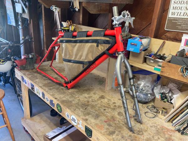 This beautiful DeSalvo was tig-welded half a mile from my house by Mr. Mike DeSalvo, a NAHBS winner and master crafstman! It's a beautiful beast that has been my go-to trail bike. Nice Columbus Zona tubing for miles of off-road smiles. Frame bag and fork mods make it a bikepacking blitz bonanza.