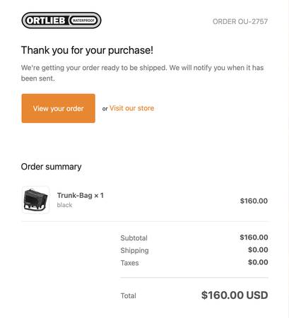New Trunk Bag for sale from high-quality German manufacturer. I bought this last month but failed to attempt to attach it to my new bike's rack until this week. Unfortunately, it didn't fit (Gazelle's rack too thick/tall) and I had exceeded the 30-day return period. Ortlieb would not take it back. Original sales price was $160.00. Cash and carry only.