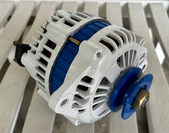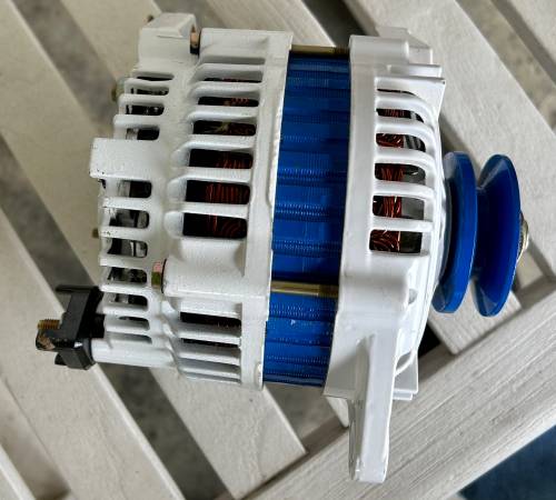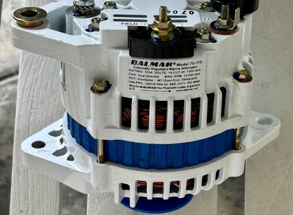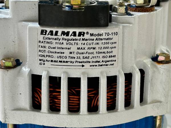NEW NEVER USED Balmar Marine Alternator Model 70-110. Small-case, high-output marine alternator with a maximum output of 110 amps. It is designed for marine applications and requires an external voltage regulator for proper multi-stage charging. Primarily used in marine environments to provide robust charging for large battery banks. The housing is made of cast aluminum with a corrosion-resistant powder coat finish. It features high-airflow frames and dual internal fans designed for efficient cooling, which is vital in confined engine spaces. $600