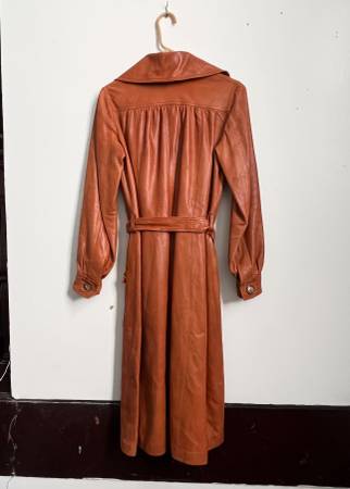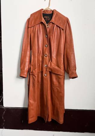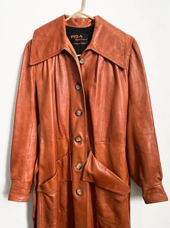 Women's fantastic, size small orange/dark tan leather full length coat from PIZA Brand. Great supple quality leather with big stylish front pockets, big big collar, button up front and button up cuffs, with a long leather waistbelt to give you the snug look and feel.