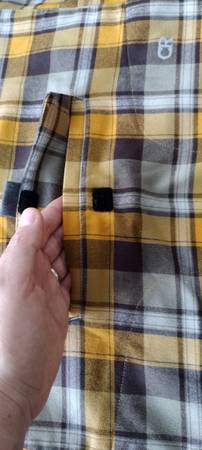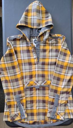 This jacket is from the mountain bike clothing brand Club Ride. It's a quarter-zip style pullover hoodie with snaps on the top closure and sleeves. There are two side pockets and a kangaroo front pouch with Velcro closure. It's in like-new condition, with no rips, fading, pilling, or odors. The color is true to the photos.