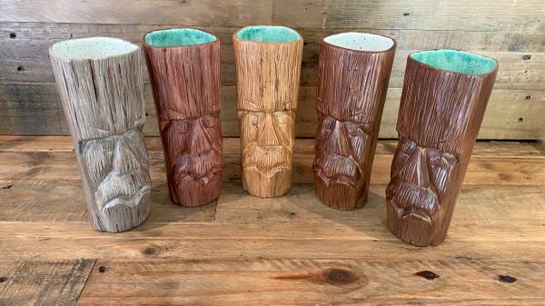 5 Mugs with a zig-zag mouth, triangle nose, and wood-grain appearance. This tiki mug was made by Johnny Sens and is marked as such. In fantastic condition, no cracks, nicks, blemishes etc. I'm...