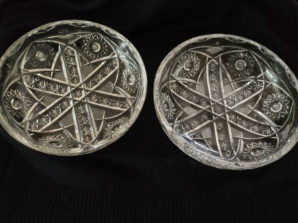 Beautiful, 2 identical crystal serving plates in excellent condition. Lovely Stars pattern, 7 inches in diameter. European crystal.