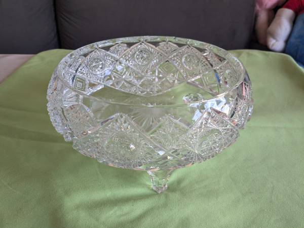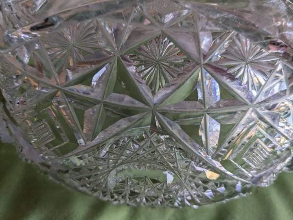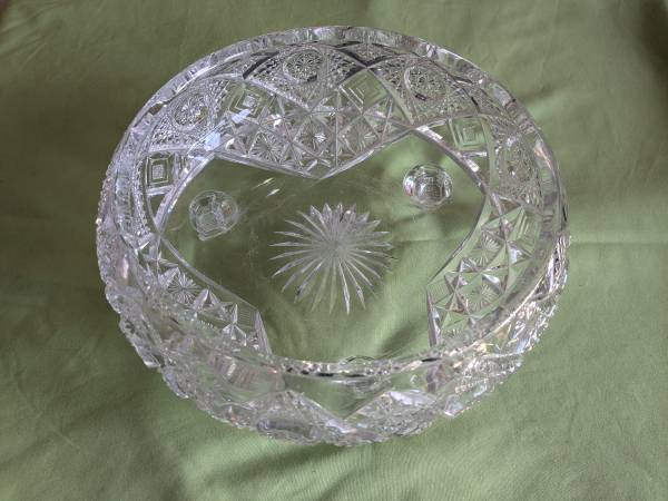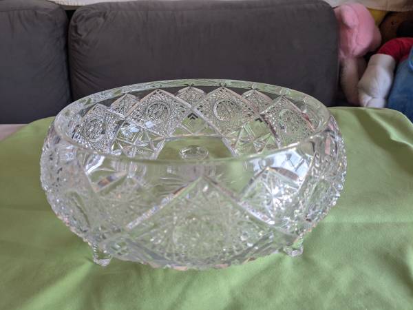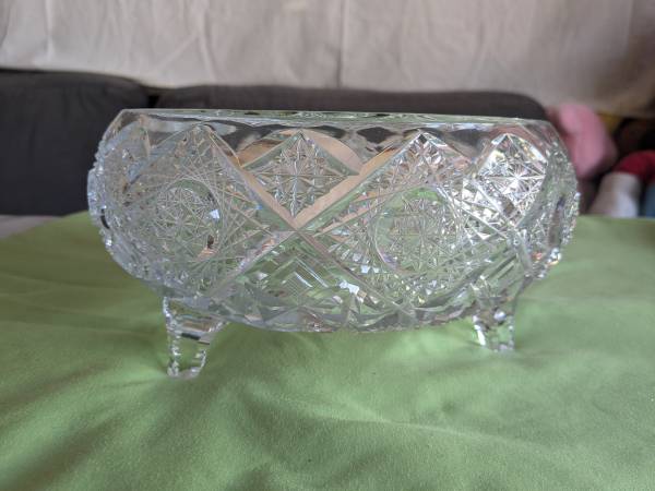 Hi. I'm selling my awesome Clark American Brilliant Deep hand Cut Antique Crystal Bowl with Foot. In excellent overall condition. Circa 1940s. This heavy crystal bowl is beautifully crafted with tons of detail. Looks amazing as a stand alone decor or as a centerpiece Bowl for wedding decoration. Also would work as a fancy fish bowl. The possibilities with this piece is endless. The size is just right with its dimensions as follow: 8 3/4" x 4 3/8"H. Selling this rare crystal bowl now for $200. Cash only