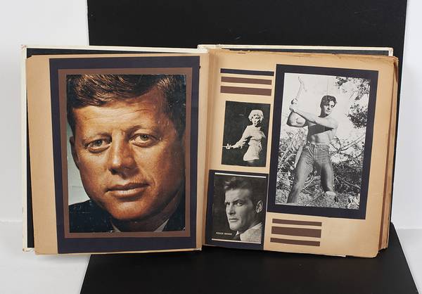 Super fun 1950's large scrapbook of Hollywood celebrities and a few politicians like JFK and Robert Kennedy. Features James Conrad, Rock Hudson, Marilyn Monroe, Roger Moore, Gregory Peck, Harry Belafonte, Dorothy Malone, James Dean, Kim Novak, Cary Grant, Marlon Brando, Paul Newman, Troy Donahue, George Peppard, "Gone With The Wind" Vivienne Leigh, Clark Gable, Ava Gardner, Sophia Loren and many more I can't put a name to the face.