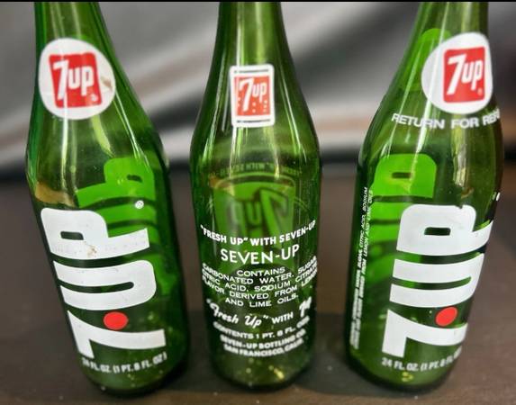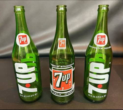 Large Vintage Wooden 7up Bottle Crate With (3) 24oz Green Glass 7up Bottle Lot. No chips or cracks detected on bottles, just need a good cleaning. The crate is still holding strong with normal wear from age and use. Please view pictures carefully for details and condition. Feel free to contact me with any questions. Thanks!