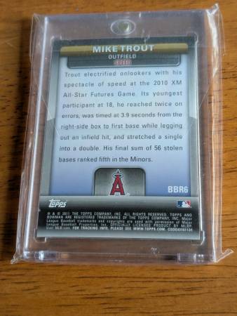 Mike Trout Los Angeles Angels 2011 Bowman's Brightest Speed Rookie Card #BBR6 for sale. Purchased this card brand new at San Francisco Sports Card show. Card is NM-Mint and in excellent condition....