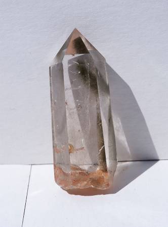 Great piece of ghost quartz with a green ghost 1/2 pyramid mirroring the top point. Beautiful tip. A good number of inclusions creating refracted light. Other green ghost appears on the lower half too. Needs to be seen in person but shows visibly in the photos.