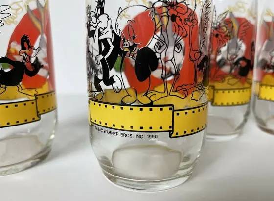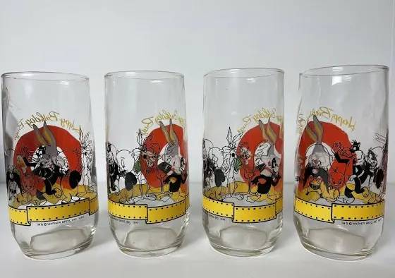 Hello. On sale here is my set of 4 Vintage 1990 Warner Bros. Bugs Bunny "50th" Birthday Glasses / tumblers. In new condition despite being over 30+ years old. No chips, cracks, and stains anywhere!!! These are highly priced collector's items. Ideal for collectors and people who enjoy watching Bugs Bunny growing up. Dimensions: 2 3/4"W x 6"H. Selling for $70. Cash only