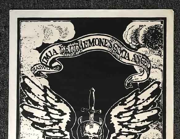 The plot is in 1672 Cuban revolutionaries launch an uprising against the Spanish who are occupying the country. Great black and white artwork by Antonio Perez Gonzalez known as Niko made using silkscreen printing features a winged skull with horns pierced with a dagger and crossed bones under it surrounded by clouds on a black background. Excellent lettering.