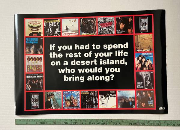 Cool Stones poster with photos of 20 Rolling Stones lp's around the border with the quote "IF YOU HAD TO SPEND THE REST OF YOUR LIFE ON AN ISLAND, WHO WOULD YOU BRING"