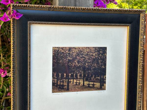 Jardin du Luxembourg and Place des Vosges. Beautifully framed and matted in 20x21 frames and both are 9x7 inches. I apologize for the glare in the photos. Second pair is from another local artist and measure 8x8, some wear and chips noted.