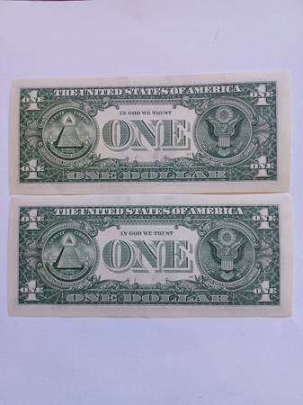 2 USA 2021 One dollar bills, Federal Reserve notes, Banknotes, currency fancy consecutive serial numbers uncirculated.