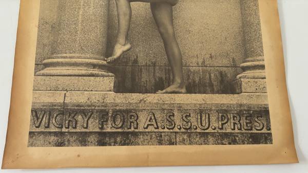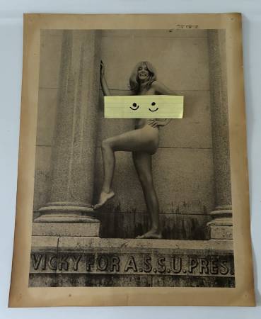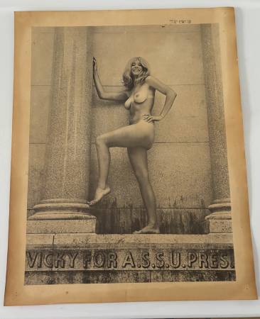 The famous poster of Vicky Brago-Mitchell who in the 1960s as a Standford Univ student while working as a topless dancer ran for student body president. In 1968 she worked under the stage name Vicky Drake and ran for student body president with a campaign poster that was a photo of herself posing nude on the Stanford Mausoleum. Sadly, she didn’t win!!