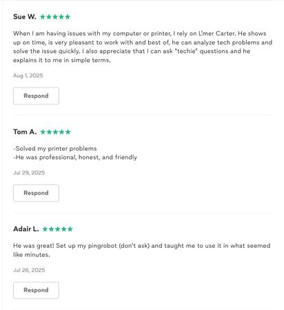 I hold CompTIA A+, Network+, Security+, and a Google Cybersecurity Certificate. I’ve worked with all kinds of users especially seniors and I pride myself on being patient, respectful and clear. No pressure no confusion just help.