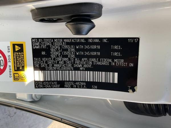 Very Nice AWD LE Plus, Leather, Rear View Back Up Camera, Power Tailgate, Roof Rack, Alloy Wheels with Good Matching Tires, Push Start Ignition, Toyota Safety Sense Pre-collision w/Pedestrian Detection, Lane Departure Warning w/Steering Assist, Dynamic Radar Cruise Control, Entune Audio Plus, Power Driver Seat, Drives Excellent!.All advertised prices exclude government fees and taxes, any finance charges, any dealer document preparation charge, and any emission testing charge. While we try to make sure that all prices posted here are accurate at all times, we cannot be responsible for typographical and other errors that may appear on the site. We make every effort to provide you the most accurate, up-to-the-minute information; however it is your responsibility to verify with the Dealer that all details listed are accurate. The dealership is not responsible for typographical, pricing, product information, advertising or shipping errors. Advertised prices and available quantities are subject to change without notice. All rates and offers are dependent on bank approval, which varies based on applicant's credit as well as the vehicle.