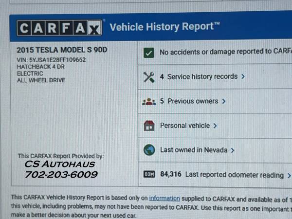 Carfax reports 5 Owners from CA-AZ-NV, but probably actually 2-3. One listed "owner" had it for 17 days, 2 others had it for 6 mos each, so these were more than likely license plate renewals. No accidents reported, and 4 service records. Tesla's have very little maintenance, so having only a few records is very common. Afterall, they have 90% less parts than a gas car......Trade ins possible, I need to touch-see the car, can add cash or go straight across, and can beat Carmax or Give me the Vin offers as well. ......