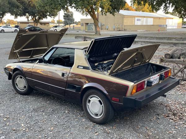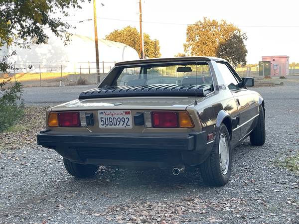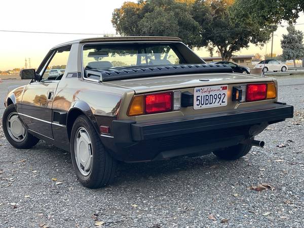 1985 Fiat/Bertone X 1/9 targa. Original Marrone/Oro two-tone paint with matching cloth/vinyl interior. 1.5-liter engine with factory fuel-injection and 5-speed transmission. All-original, 3-owner California car with zero rust and 53,000 miles. Always garaged and well maintained with lots of recent work including brakes, tires, fuel pump, timing belt, water pump, etc. No leaks, all accessories work, and runs, drives, and looks like new. Original keys, owner’s manuals, tool kit, spare tire, and car cover included.