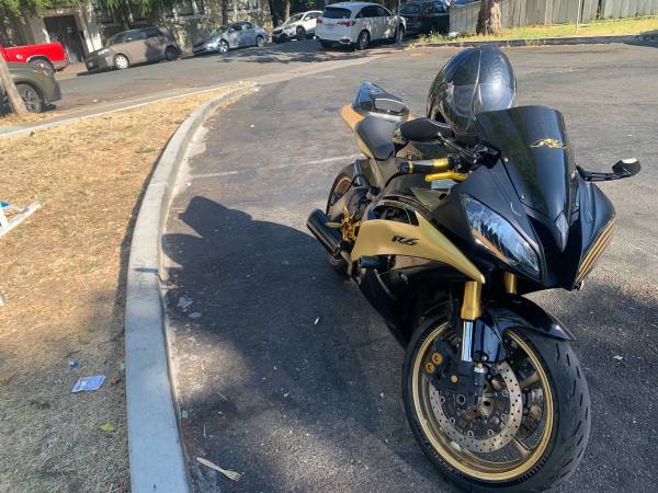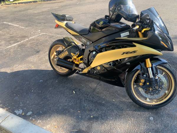Up for sale I have a custom Yamaha R6 golden black this bike has a rebuilt motor brand new tires brand new radiator stater alternator, new battery all paperwork on hand. This is an excellent bite garage a lot of upgrades and it comes with extra body parts. That’s never been used still in the box, the body parts are white they can be painted any color of your choice