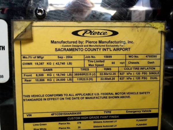 Heavy-duty 2004 Pierce Fire Truck Pumper professionally manufactured by Pierce Manufacturing Inc and originally custom-built for Sacramento County International Airport. Pierce is one of the most trusted names in fire apparatus, known for durability and long service life