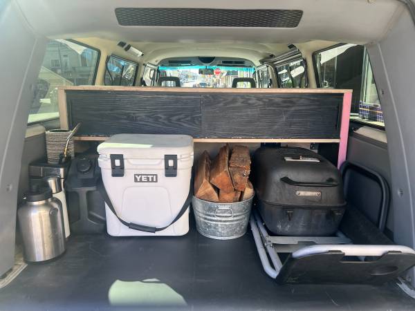 - Table - laminate top, table mounts onto the side wall of the van, and can be removed and repositioned across the two banquettes to form a platform for an air mattress. The bed is a little snug for large humans