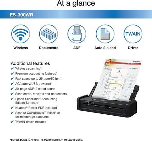Hi. I'm selling my Epson ES-300WR Wireless Color Portable Duplex Document Scanner. In excellent condition. Boasting the fastest scan speeds in its class and premium accounting features to easily organize receipts and invoices, the portable WorkForce ES-300WR duplex document scanner is the perfect tool for scanning important documents and expenses. Wirelessly scan 2-sided reports, business cards and receipts to laptops, tablets and smartphones. Easily scan to cloud storage accounts, or searchable PDFs and editable Word and Excel files using the included Epson ScanSmart Software. Featuring a 20-page Auto Document Feeder, the compact ES-300WR performs efficient batch scanning at up to 25 ppm/50 ipm. And, it's powered by AC, battery or USB5. Paid $400. Selling now for $250. Cash only