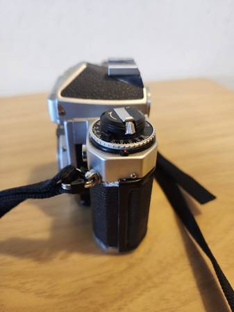 Classic Nikon FE 35mm film camera body. The battery check light turns on and the condition is overall very good for its age. The shutter release button is currently stuck and the bottom screws appear stripped, so it will need repair or servicing before use. May be an easy fix for someone experienced. (See photos)