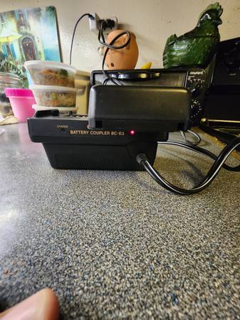 This Quasar full-size VHS camcorder dates to 1989 and features the classic late-1980s brick-style design popular for analog video aesthetics. The unit is clean overall and includes original accessories. The AC battery charger powers on and shows a charge indicator, but the rechargeable battery does not hold a charge due to age. The camcorder has not been fully tested and is being sold as-is. The viewfinder does display an image; however, the eyepiece housing shows damage/wear and may need attention. The original carrying bag shows some cosmetic dirt from storage. No battery corrosion observed. Please review photos carefully for condition and included items.