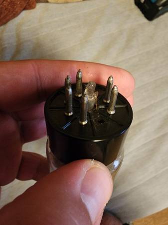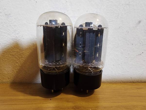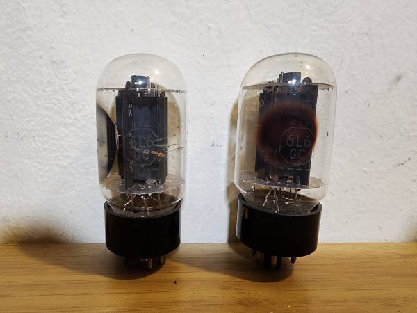 One tube has a **chipped plastic alignment post** on the center base (see photo), but it fits into sockets normally and performed at full output during testing. The other has no base damage. These are solid working tubes from a clean estate set.