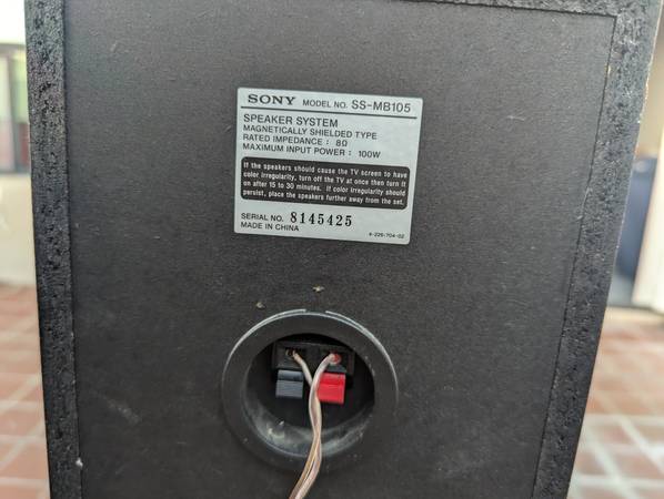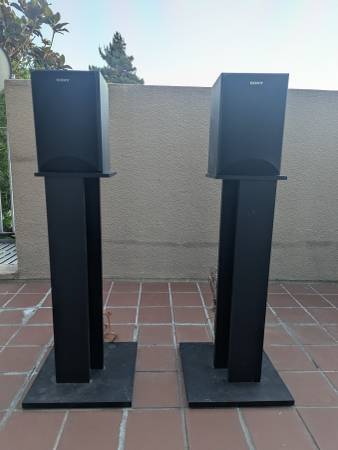 2 Sony speakers with a stand each. Working condition. Connect with wires to home theater system. Stands help you place it around the room and at a height. Model number SS-MB105