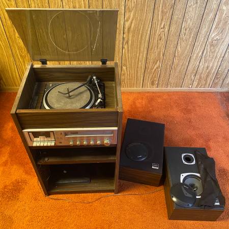 Please note that this stereo system has not been tested and its working condition is unknown. It is being sold AS IS, ideal for someone interested in restoring or repurposing vintage audio equipment. One of the speaker grille coverings is loose, as shown.