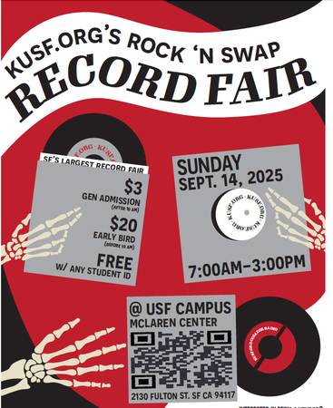 KUSF’s Rock’N’Swap record fair dates back to 1983 as a destination event for music lovers and collectors. Everyone from passionate collectors to the simply curious can dive into hundreds of crates to browse and shop records, CDs, tapes, music memorabilia, and posters from over 55 vendors, offering a variety of genres from jazz to rock and roll and everything in between. Come to McLaren Center on Sunday, September 14 to discover bargains along with hard-to-find rarities and collector’s items.