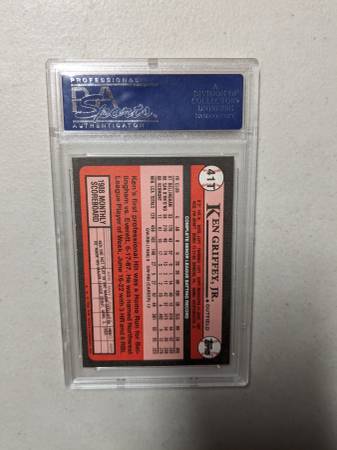 Hi. I'm selling my 1989 Topps Traded Ken Griffey JR PSA 10 Rookie RC Card #41T. This is a Iconic 1989 Topps Traded baseball card featuring Ken Griffey Jr., a Hall of Fame player. The card is graded a perfect 10 by Professional Sports Authenticator (PSA) It is a rookie card and has the card number 41T. The card represents Griffey in his early years with the Cincinnati Reds and Seattle Mariners. It is a must-have for any collector of baseball cards, especially those who admire Griffey's talent and impact on the game. This card is a true gem and a great addition to any collection. Selling now for $1,000. Cash only