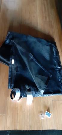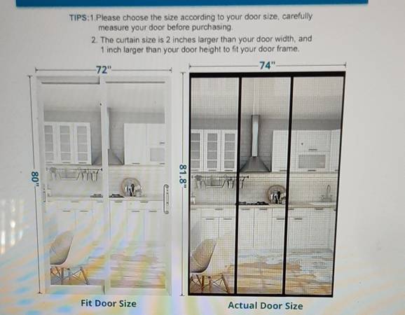 New double black screen with magnetic closure, fits door size 72 x 80" The screen is made of fiber glass Kit includes 1.5" adhesive tape 3/4" adhesive tape Black push pins (optional use for extra...