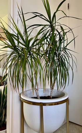 Large Dracaena Draco in a plastic white pot with metal stand. The plant is in great condition and has been in this pot for a couple months, only getting rid of due to space.