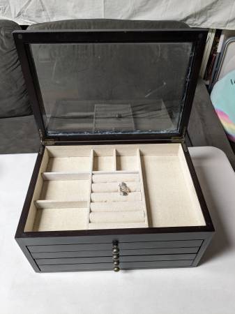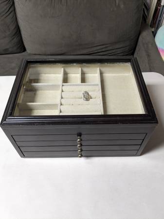 Hi. I'm selling my 4-tier Luxury Watch, Sunglasses, Jewelry Display Case, box, Organizer. In excellent condition. Beautifully crafted and handmade. Circa 1990s. Great to store all your collectibles! Dimensions: 14 1/2" x 10" x 7 1/2"H. Selling now for $30. Cash only